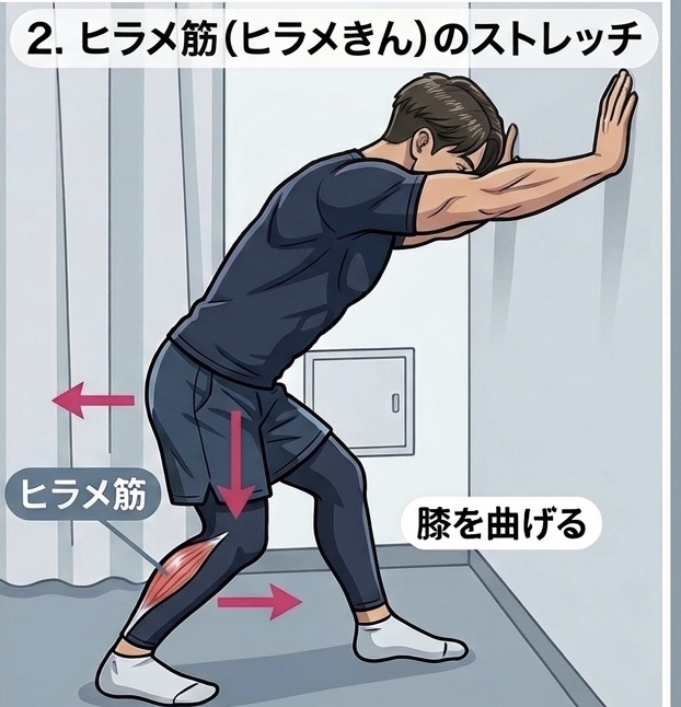 膝を曲げて行うヒラメ筋ストレッチ:スネの骨を強く引っ張るヒラメ筋を伸ばします。