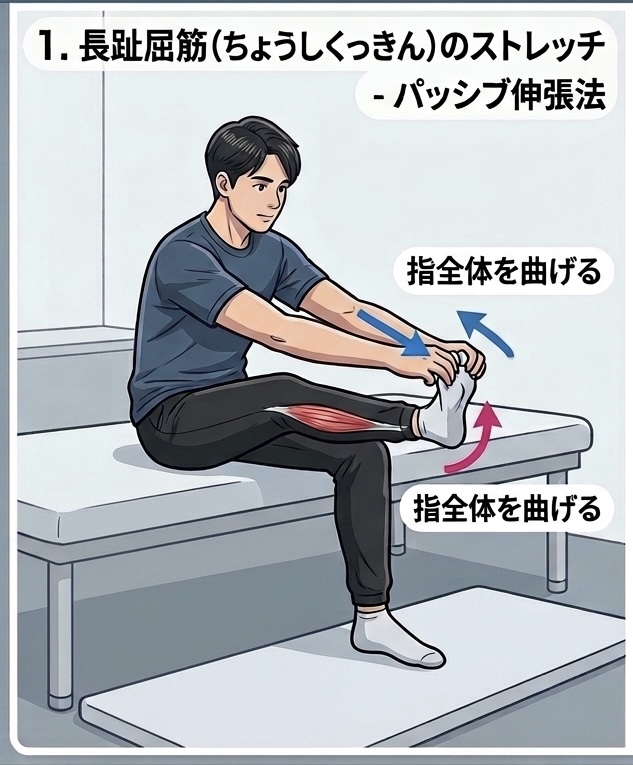 ・手で足の指の全体(5本すべて)を掴み、体に近づけるようにぐーっと反らせます。