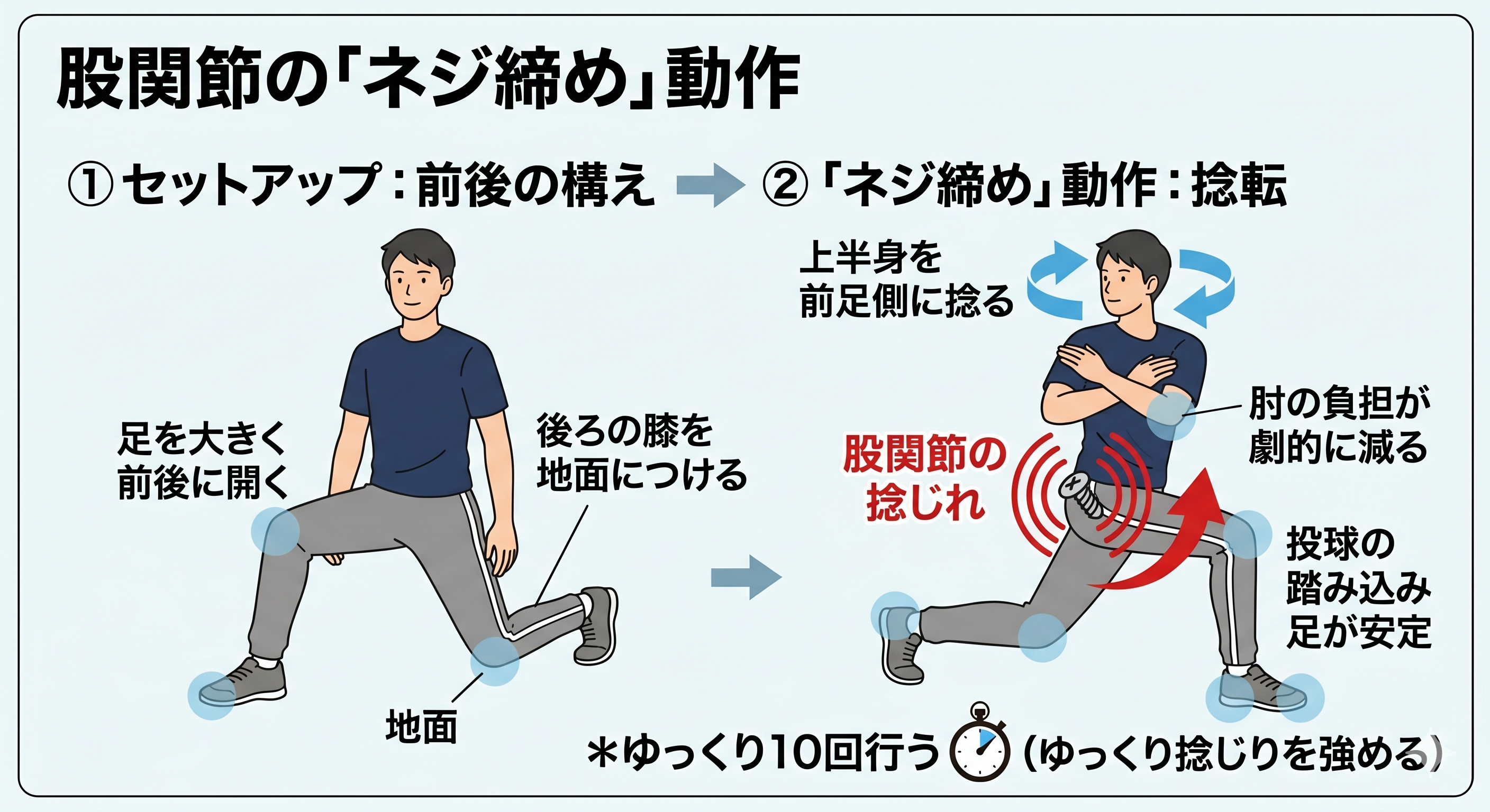 前足に体重をかけながら、上半身を前足側に捻ります。投球の踏み込み足が安定し、肘の負担が劇的に減ります。