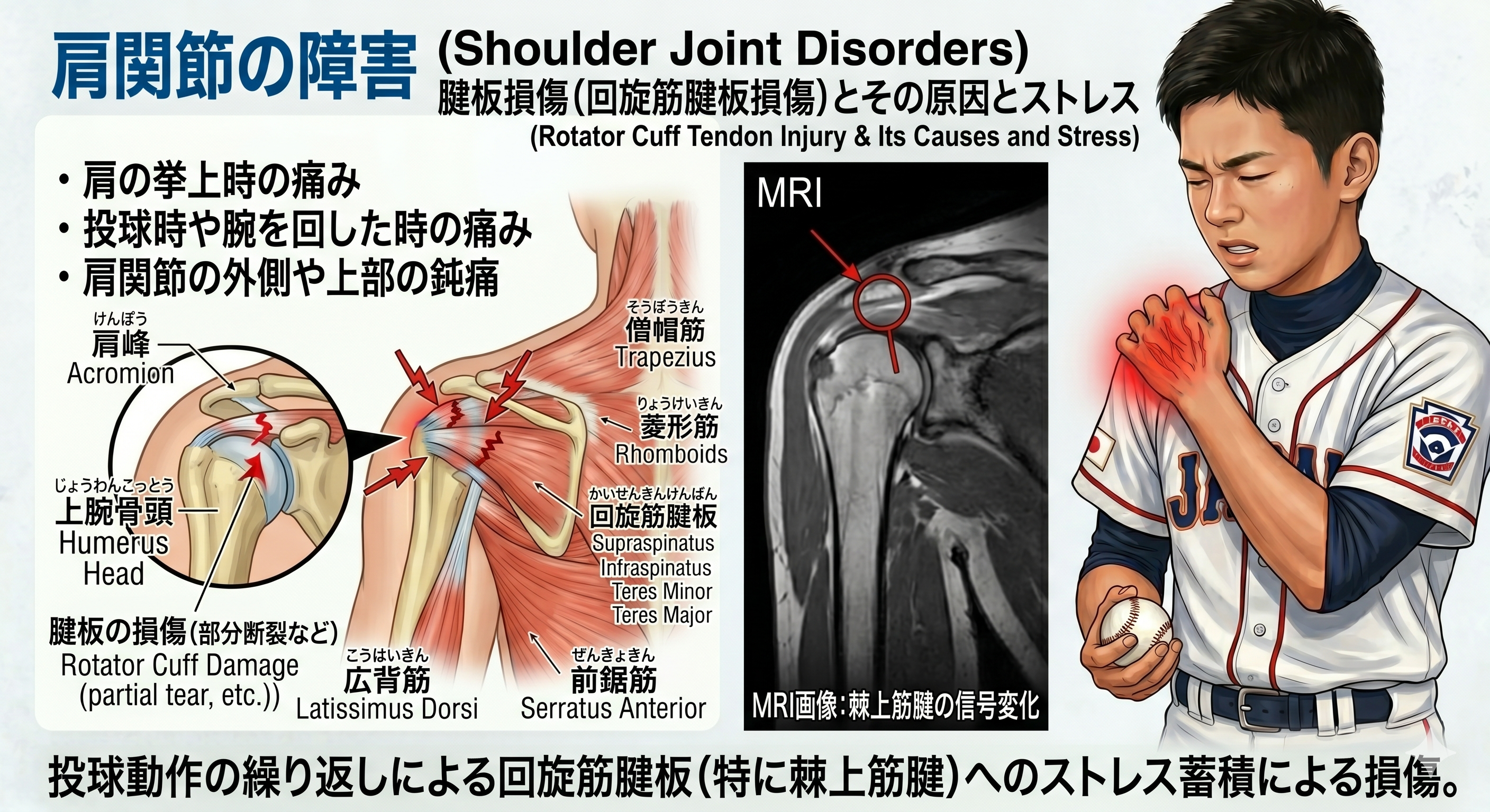 10代の選手特有の怪我です。肩の骨にある「成長線(軟骨)」が、投球の強烈なひねり動作によって捻じ切られるように開いてしまいます。 レントゲンで見ると、成長線が通常より広がっているのがわかります。これは骨の成長障害につながる可能性があるため、絶対的な安静と、その後の徹底的なフォーム修正が必要です。
