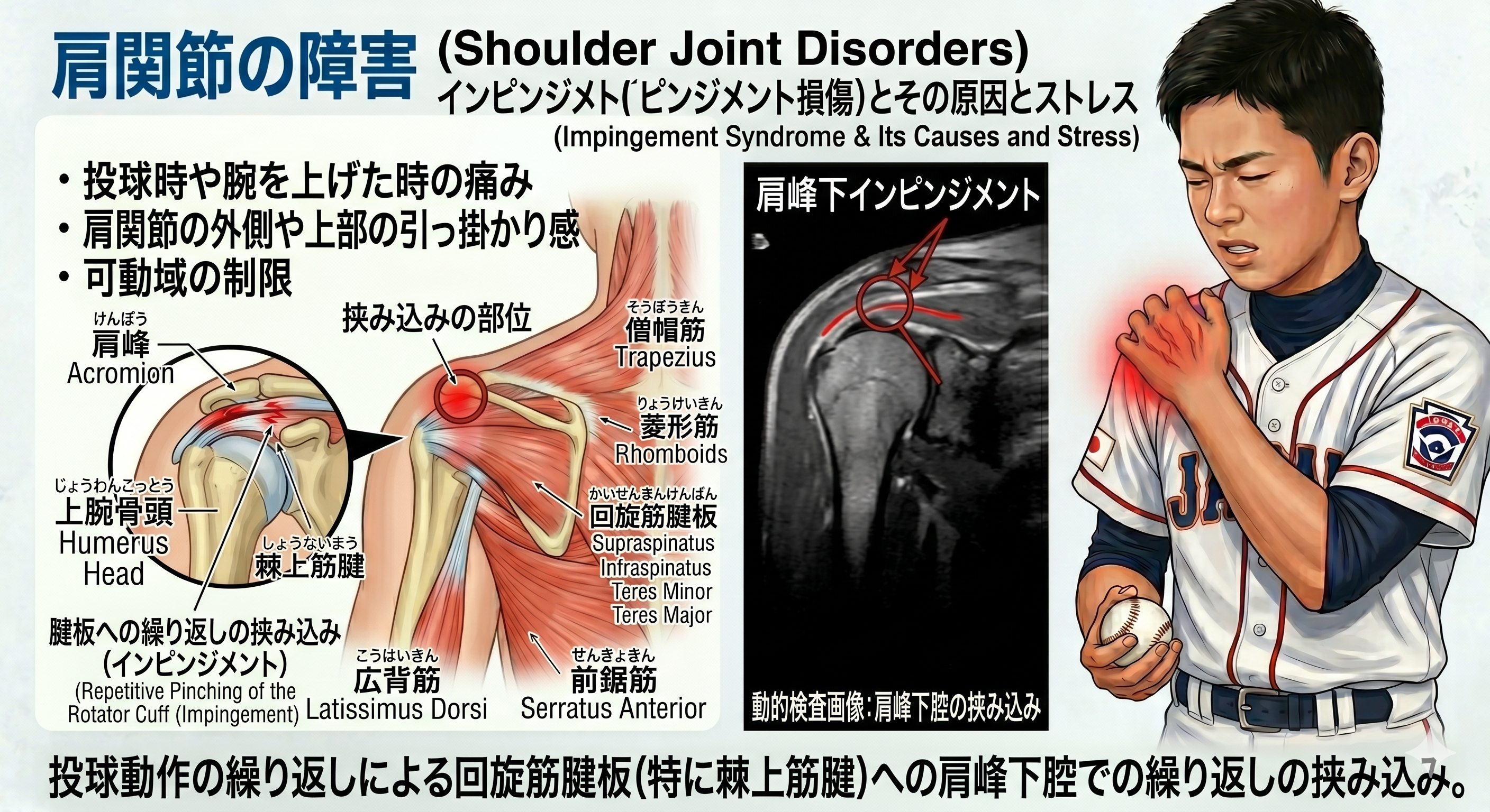 通常、腕を3度上げるとき、肩関節が2度、肩甲骨が1度の割合で連動して動きます。これを「肩甲上腕リズム」と呼びます。 しかし、現代の球児はスマホの使いすぎや勉強姿勢により、強烈な猫背(巻き肩)になっています。肩甲骨が背中にへばりついて動かないまま無理に腕を振ろうとすれば、その「動かない1度分」のシワ寄せはすべて肩関節に集中し、炎症を引き起こします。