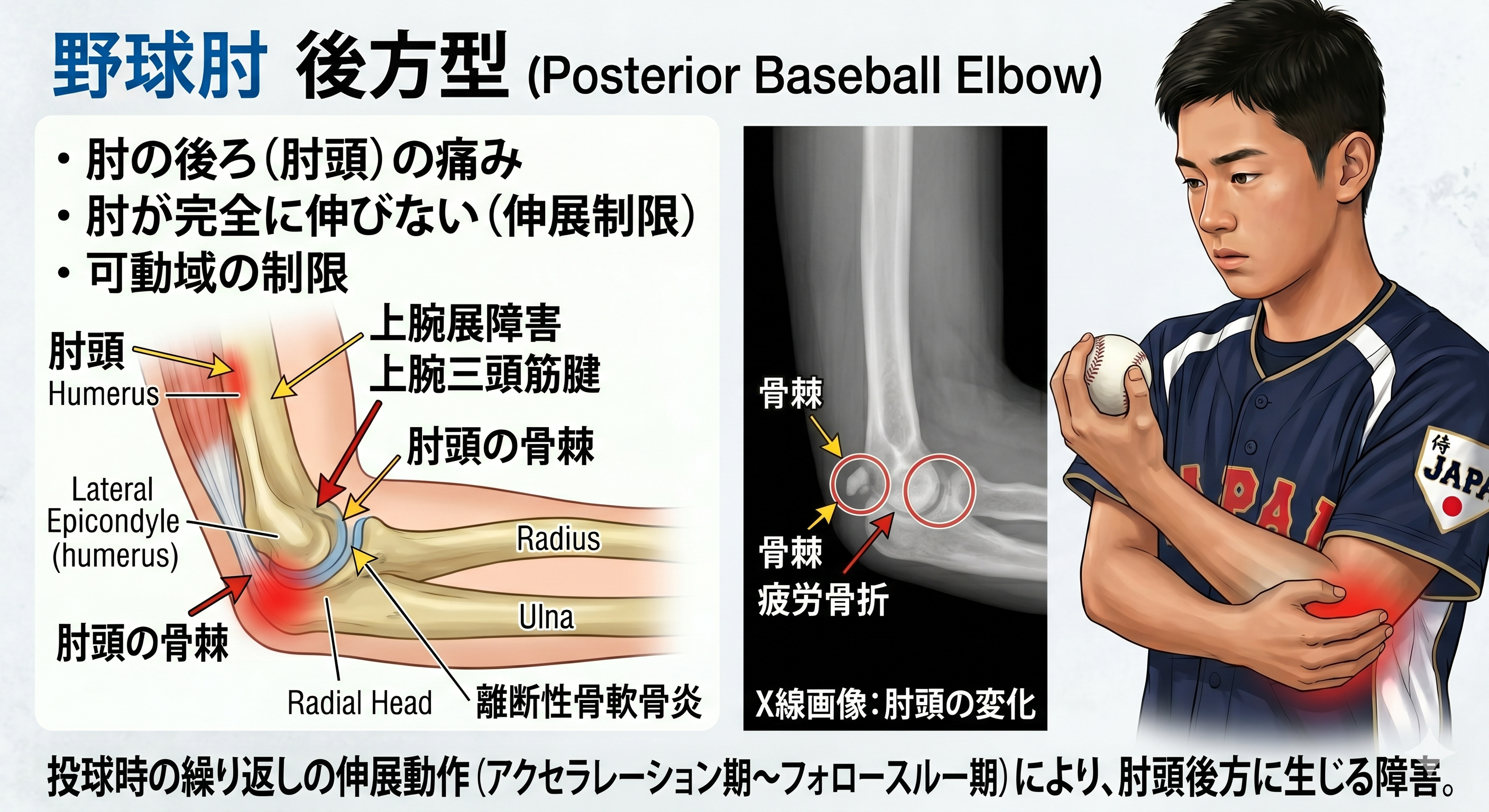 ブレーキの故障: 腕を振るための筋肉(アクセル)ばかりが発達し、腕を安全に止めるための背中や肩の筋肉(ブレーキ)が弱い選手に多く見られます。勢い余った肘がガツンとぶつかり、骨棘(こつきょく)というトゲのような骨ができたり、疲労骨折を起こしたりします。