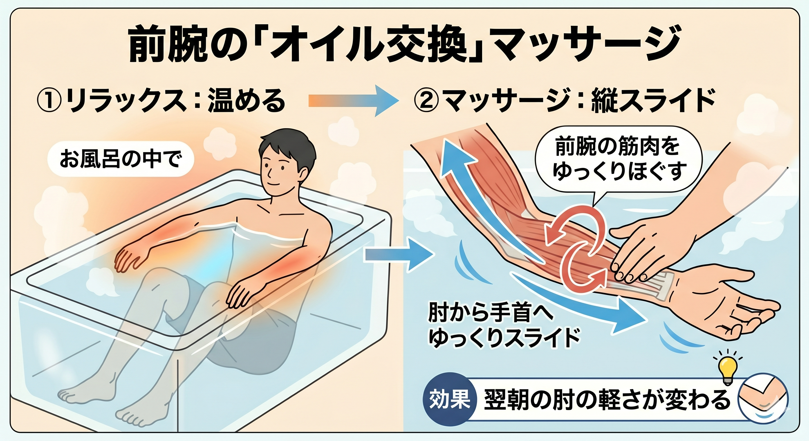 前腕の「オイル交換」マッサージ 肘から手首にかけての筋肉を、お風呂の中でゆっくりと縦方向にスライドさせて揉みほぐします。これだけで、翌朝の肘の軽さが変わります。