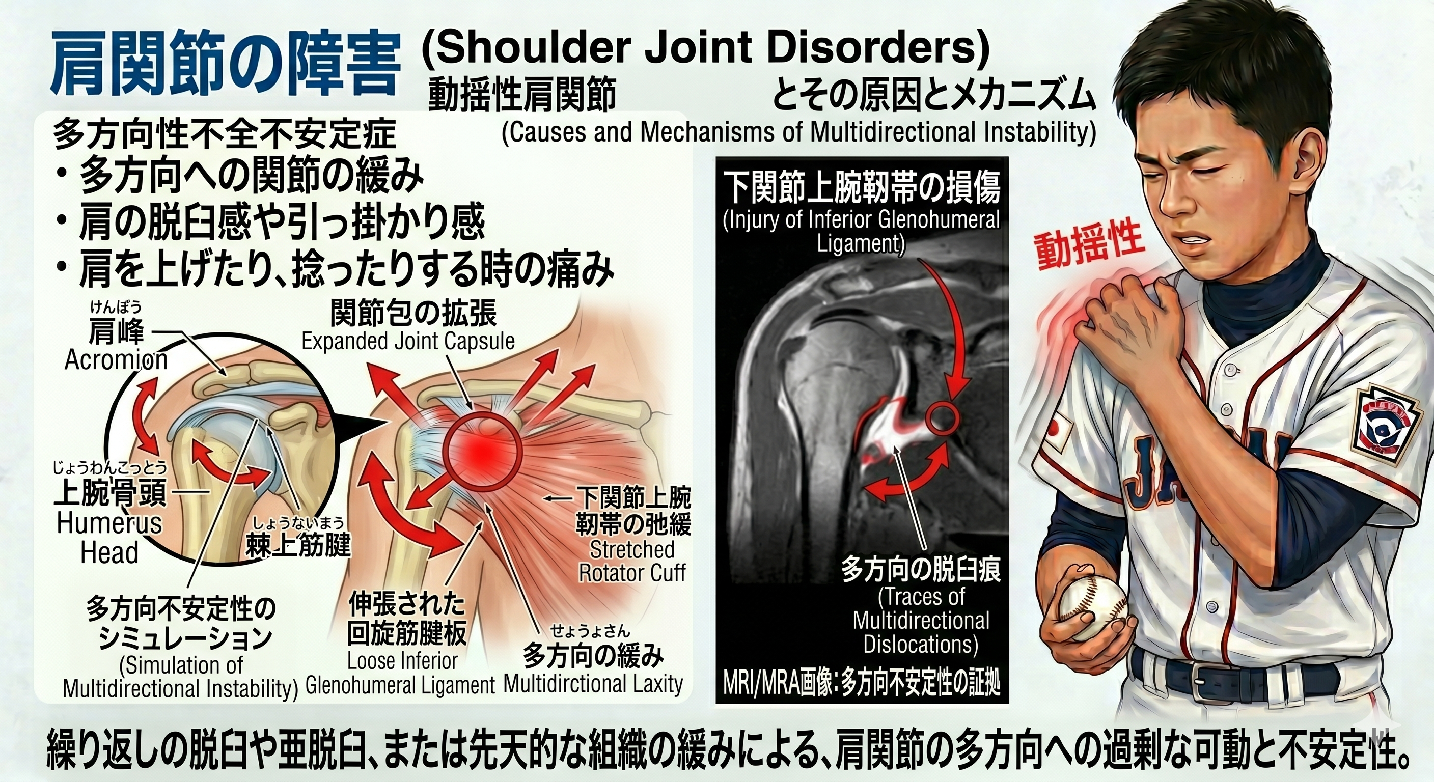 ルーズショルダー(動揺性肩関節) 先天的に肩の可動範囲が広い方に起こりやすいです。 肩の可動範囲が広いことは投球動作にとってプラスな面もありますが、脱臼を繰り返したり、ボールを投げた後に肩に違和感が残ったりします。