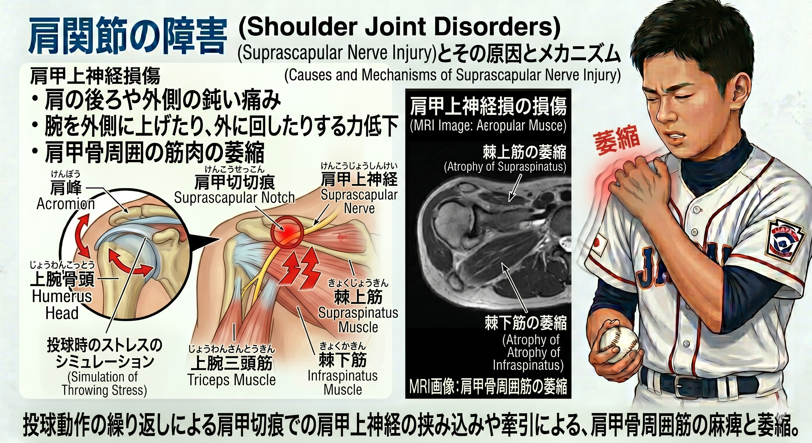 肩甲上神経損傷 ボールを投げる際に肩甲骨の上を通る肩甲上神経が圧迫を受けたり、損傷したりする症状のことです。この症状では肩の疲労感や動かしにくさ、筋委縮が見られます。