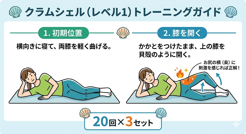クラムシェル(レベル1): 横向きに寝て、両膝を軽く曲げます。かかとをつけたまま、上の膝を貝殻のように開きます。