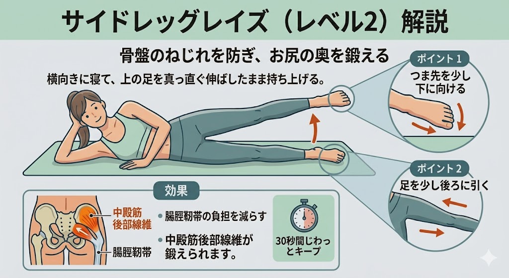 サイドレッグレイズ(レベル2): 横向きに寝て、上の足を真っ直ぐ伸ばしたまま持ち上げます。ポイントは「つま先を少し下に向ける」ことと「足を少し後ろに引く」こと。これにより、腸脛靭帯の負担を減らす中殿筋後部線維が鍛えられます。
