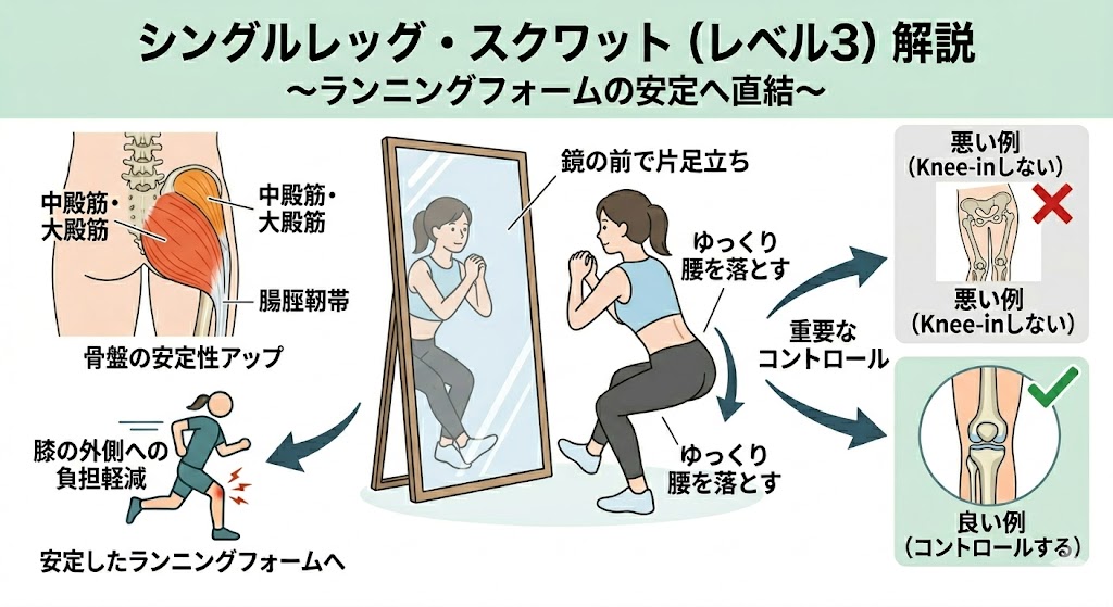 シングルレッグ・スクワット(レベル3): 鏡の前で片足立ちになり、ゆっくり腰を落とします。この時、**膝が内側に入らない(Knee-inしない)**ようにコントロールします。これがランニングフォームの安定に直結します。