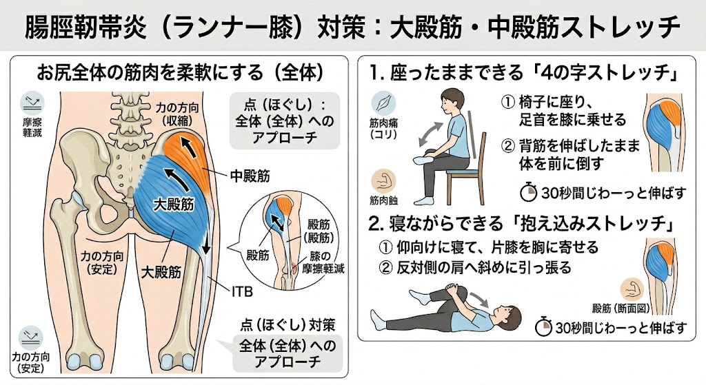 大殿筋・中殿筋のリリース: お尻の大きな筋肉が硬くなると、腸脛靭帯を後ろ側に引っ張り、膝での摩擦を強めてしまいます。