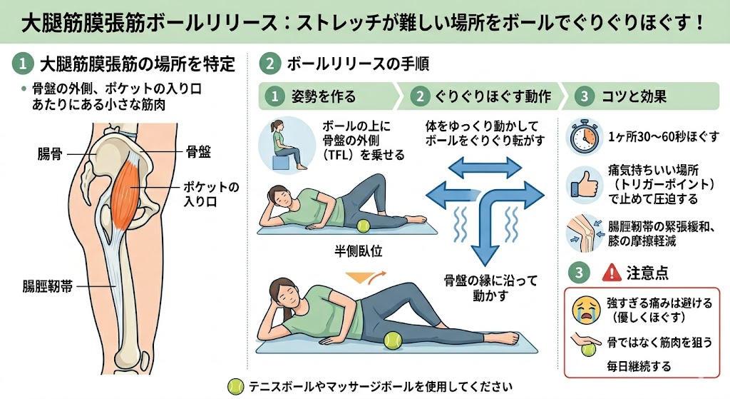 大腿筋膜張筋(TFL)のリリース: 腰骨の少し下、ポケットの入り口あたりにある小さな筋肉を、テニスボールやマッサージボールで優しくほぐします。