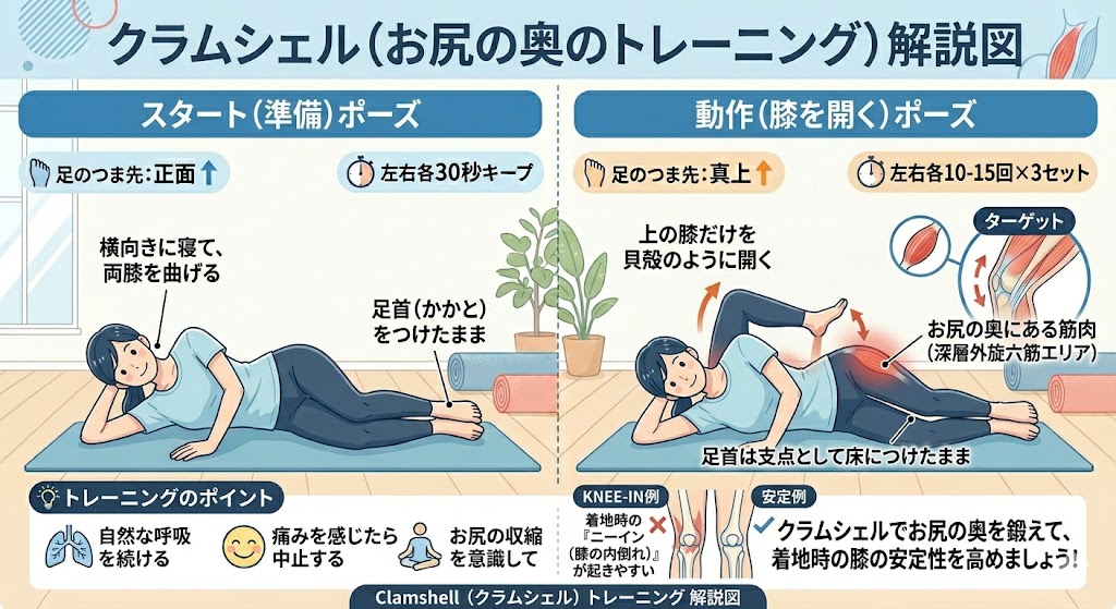 横向きに寝て、両膝を曲げます。足首をつけたまま、上の膝だけを貝殻のようにパカパカ開きます。 お尻の奥にある筋肉を鍛えることで、着地時の「ニーイン(膝の内倒れ)」を強力に防ぎます。