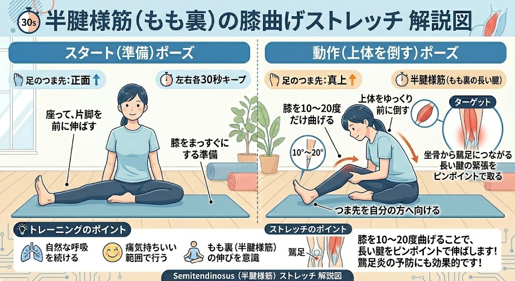 通常のもも裏ストレッチを、膝を**「10度〜20度だけ曲げた状態」**で行います。 こうすることで、坐骨から鵞足につながる長い腱の緊張をピンポイントで取ることができます。