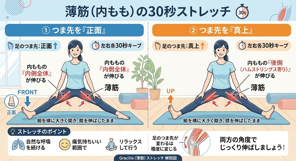 ① 薄筋(内もも)の30秒ストレッチ